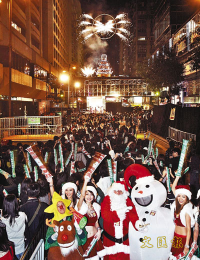 天公造美,平安夜氣溫回升,大批市民中午過後開始湧到各區迎接聖誕來臨,夜幕降臨後,氣氛更加熱烈。每年的慶祝熱點維港兩岸,大小商場擠滿搶購減價貨的市民、戲院座無虛席、卡拉OK房歌聲悠揚;蘭桂坊的夜晚,人群擠得水洩不通,盛裝打扮的男男女女雖然互不相識,也一同狂歡……趁著聖誕,大家與親人聚天倫,與朋友表情誼,暫時把經濟不景的憂鬱拋到腦後。