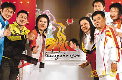 ■廣東籍的奧運冠軍、亞運冠軍在會徽發佈儀式上合影。 新華社
