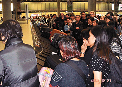 ■機場地勤罷工期間,大批乘客擠在同一條行李輸送帶旁等候行李。相片由讀者提供