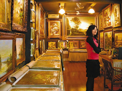 ■平安夜、聖誕節沒有賣出一幅畫,深圳大芬村盛藝達畫廊老闆娘劉雪鳳心情低沉。本報記者熊君慧 攝