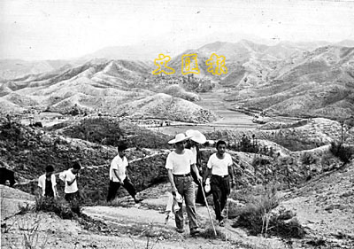 1981年的贛南還被稱為「江南沙漠」。圖為時任新華社江西分社社長的王達智(拄枴杖者)在贛南調研。