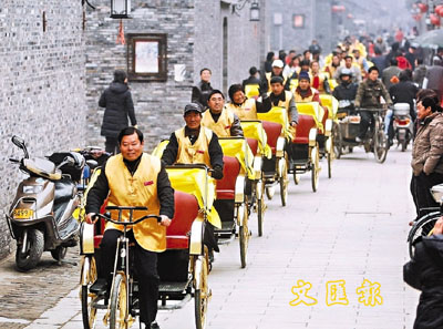 為提升城市形象,江蘇揚州市對運營的人力車進行規範化管理。首批50輛統一車型、統一人員著裝的車隊,5日亮相街頭。 新華社