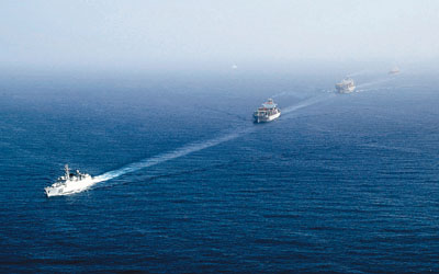 ■1月6日,在「武漢」號導彈驅逐艦的帶領下,被護航的中國商船一字排開航行。 新華社
