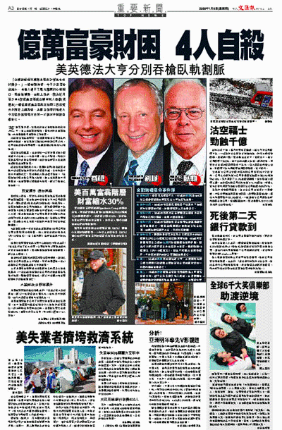 過往的金融風暴,也曾導致一些投資損手的小股民或中小企商人一時想不通,踏上不歸路,但較少見的是像今次的金融海嘯,有躋身全球百大富豪榜的超級富豪自尋短見。