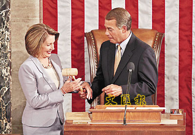 ■眾議院少數黨領袖波納將象徵權力的手錘交給佩洛西。 美聯社