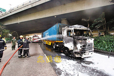 一輛行走中港兩地拖頭,昨午1時許在葵涌貨櫃碼頭提取一個滿載塑膠原料40呎長貨櫃離開擬運往內地。當沿青朗公路途至青衣西北交匯處,拖頭車底突然冒煙著火,姓陳司機(見小圖)發覺停車報警,消防員到場時,拖頭已陷入火海,開喉將火救熄後,惟拖頭已嚴重焚毀,幸無波及貨櫃內的塑料。事故令到青朗公路往新界方向一度全線封閉,交通嚴重阻塞。 本報記者蔣焯文 攝