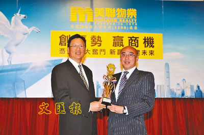 美聯新界區沙田大埔豪宅及大埔屋h區域營業董事余永泰,於早前舉行的管理月會上,從美聯集團主席黃建業手上,接受08年下半年度「董事業績大獎」殊榮的嘉許獎盃。