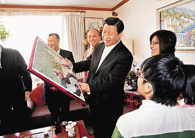 習近平又贈送胡先生一套紫砂茶具,當胡先生笑言禮物比他平時常用的茶具好時,習副主席謙厚地笑說:「是各有特點。」胡先生的子女則向習副主席送上一幅以意大利通心粉砌成的「澳門全景畫」,習副主席從畫中一眼看出媽閣廟和大三巴,而身旁的港澳辦主任廖暉則半開玩笑說:「煮一煮都是可以吃的。」惹來哄堂大笑。