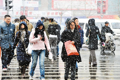 ■9日,受北方冷空氣影響,青島市迎來了2009年第一場降雪。圖為行人頂著飛雪經過香港中路一人行道口。 新華社