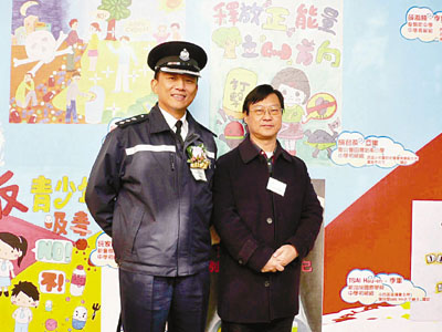 西區警署昨日舉行反青少年吸食危害精神毒品活動,收集西區及南區超過30間中、小學校的學生版畫作品,部分得獎作品會繪畫於警署外牆,宣傳禁毒意識。西區警區指揮官岑維健總警司(左)表示,活動獲得兩區過半數學校支持,共收集得4,400多件作品,宣傳成效顯著。他又強調警方會以「教育、宣傳、行動」三管齊下,打擊區內任何吸毒活動,日後亦會多舉辦跨區滅罪行動,主力加強青少年禁毒宣傳。 本報實習記者鍾愛連 攝