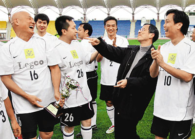 ■曾鈺成到場向旗開得勝的立法會足球隊頒獎,並與一眾隊員進行「賽後檢討」。本報記者梁祖彝 攝