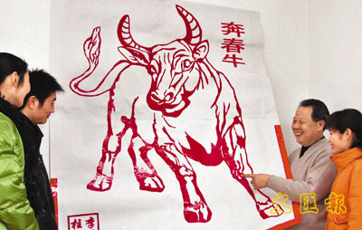 山東棗莊65歲的退休老人李同柱取材生肖牛圖案,歷時6天創作的紙刻作品《奔春牛》公開亮相,喜迎新春的到來。該作品長1.6米、寬1.4米,是李同柱老人在彩紙上精描細刻出來的,具有濃郁的地方特色。 ■本報駐山東記者 于永傑、通訊員 吉哲