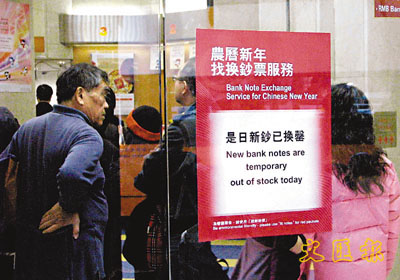 ■每當農曆新年臨近,香港的發鈔銀行都要發行3億至4億張鈔票,以滿足市民新年封利是所需。圖為去年情況。 資料圖片
