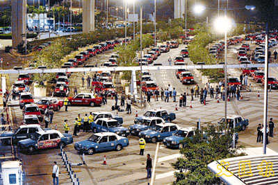 ■行政會議通過綠的「短加長減」新收費方案,本周五刊憲後生效。圖為早前綠的不滿被搶生意,在機場堵塞紅的通道,令機場的士服務癱瘓。 資料圖片