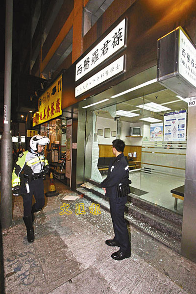 ■警方在西醫醫務所刑毀現場調查,地下滿布玻璃碎片。本報記者鄺福強 攝