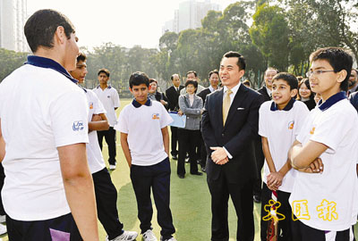 律政司司長黃仁龍昨訪問屯門區,包括探訪一群參加了寶田h「愛.共融」好鄰里互助計劃的區內婦女及兒童、南亞裔少年警訊成員,及為區內弱勢社群提供就業機會的香港聖公會福利協會康恩園「樂融融餐廳」。圖為黃仁龍與南亞裔少年組成的木球隊隊員談笑甚歡。