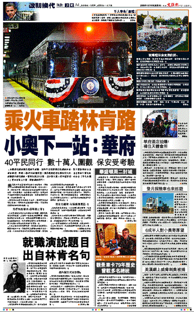 美國候任總統奧巴馬後天就職,他昨天仿傚偶像已故總統林肯,乘火車啟程前往首都華盛頓,展開一連4天的就職活動。奧巴馬是超過半個世紀以來,首名乘坐火車出席就職禮的候任總統。車程全長225公里,估計數十萬人將夾道歡迎,40多名「平凡美國人」更有幸登上火車,與新總統同行。