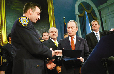 ■紐約市長彭博(右2)召開發布會讚揚墜機救援機組人員,並將贈送「紐約之匙」以作表揚。 法新社