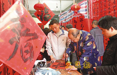 新春將至,福州南後街民間書法家的手寫春聯生意格外紅火。本報特約通訊員楊婀娜 攝