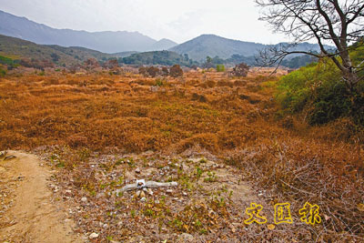 ■被譽為「蜻蜓天堂」的沙螺洞,近日逾200棵樹木及大面積野草突然死亡,現場由一片綠油油變成枯黃。圖為現時沙螺洞望向李屋方向。長春社圖片