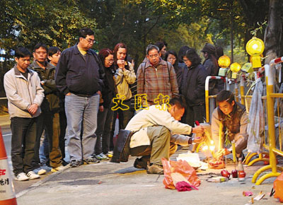 昨晨10時許,曾蔭權在多名高官陪同下,抵達現場視察,當他聽取現場警員講解時,其中一名死者馮志偉的父親,再也按捺不住悲痛,隔著站在行人路旁的大批記者,不停向特首哀求:「賠返個仔我﹗賠返個仔我﹗我個仔就係畀佢(醉酒司機)隊死我個仔……醉酒j車呀,重刑呀﹗……你唔好3年放生佢。」
