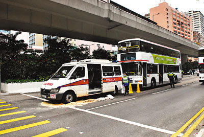 另一宗發生在昨晨9時30分,一輛警車沿葵涌道快線往新界方向行駛,至葵益道交界遇上紅燈停下,惟尾隨一輛巴士疑因收掣不及,撞向警車車尾,警車上2男1女警員在碰撞時受輕傷,事後清醒送院治療。警方後來替警車姓劉車長及53歲姓張巴士女車長作酒精測試,結果均是零度。由於意外中的警車漏出大量機油,現場路面須由食環署人員清理後,才重新開放通車。