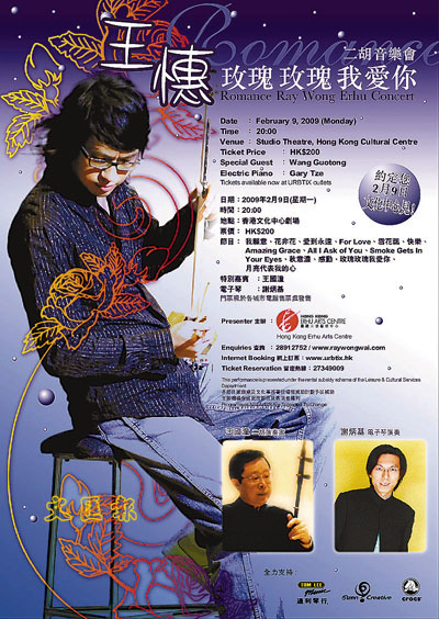 【本報訊】(記者 寧寧)香港年輕二胡演奏家王憓將於2月9日晚假香港文化中心劇場舉行「王憓玫瑰玫瑰我愛你」二胡音樂演奏會,屆時將演奏多首名曲及自創作品:《玫瑰玫瑰我愛你》、《秋意濃》、《月亮代表我的心》、《我願意》、《愛到永遠》、《雪花飄》等;演出嘉賓包括國寶級二胡大師王國潼、著名電子琴演奏家謝炳基等。