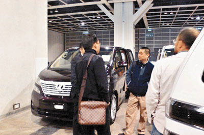 ■從事房地產生意的陳先生(中)昨到車展替公司選購7座位房車,但壓價不成功,最終沒有買。本報記者劉國權 攝