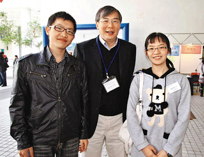 ■楊鶴冉(左一)有意報讀留學費用較美國便宜的本港大學,並向朱力徑(中)及於科大就讀的朋友查詢報讀科大的詳情。 本報記者潘政祁 攝