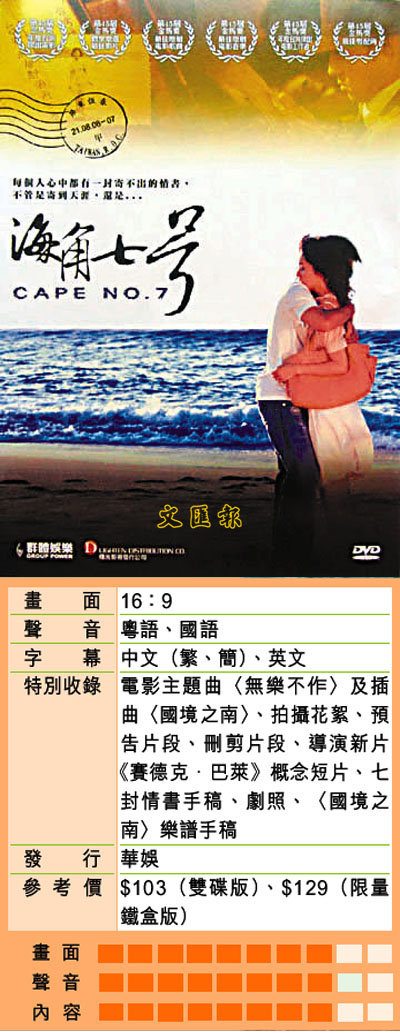 一道彩虹在恆春海岸上空橫過,雨後放晴的天空特別明亮。去年掀起旋風的《海角七號》,挾著台灣票房高收的餘威,在香港也有不俗成績。影碟最近上市,橙黑色鐵盒包裝十分搶眼。