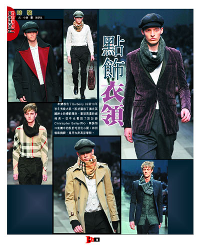 米蘭展出了Burberry 09至10年秋冬男裝大系。設計擺脫了過去英國紳士的傳統風味,重視高貴的線條美。從中也看到了設計師Christopher Bailey用心,無論領口或圍巾的設計均別出心裁。如何裝飾胸膛,原來也是高深學問。