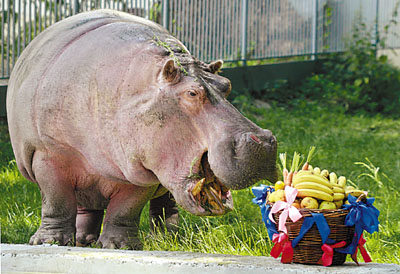 ■無論是人抑或動物,有人慶生就有笑。圖為基輔河馬Bresta的派對。