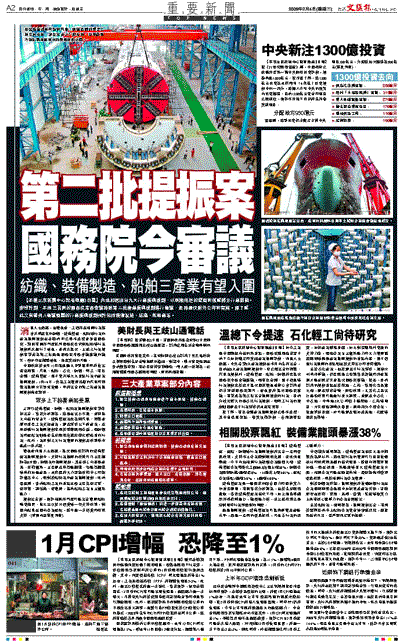 中國政府於去年11月底迅速大手筆宣佈即將推出包括鋼鐵、汽車、船舶、石化、紡織、輕工、有色金屬、裝備製造、電子資訊等九大重點行業的產業振興規劃;1月14日,作為工業發展指標的汽車和鋼鐵業振興方案率先推動,即將出台的第二批產業振興規劃備受期待。