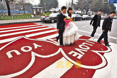 成都市交通部門近日為合江亭一條斑馬線印上「I LOVE YOU」字樣,成了當地新人和情侶的「紅地毯」。 美聯社