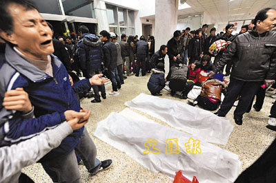 ■一名青年,日前於長樂酒吧消遣時遇火警慘燒死,入境處派員協助其家屬善後。圖為當日部分死者的遺體停放地上候領。 資料圖片