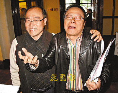 ■馮檢基(左)高調炮轟反對派區選協調機制,但昨日卻與在立法會選舉中「最不守規矩」的黃毓民扮老友。本報記者梁祖彝 攝
