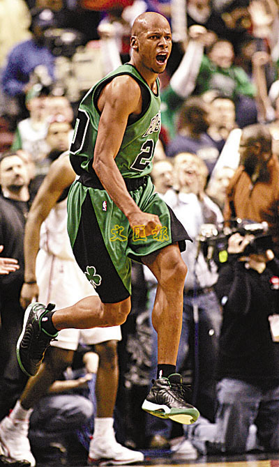 ■雷亞倫為塞爾特人射進奠勝3分球後表現興奮。 美聯社