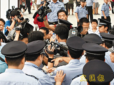 ■有香港記者擔心在採訪突發事件過程中,未能趕及申請採訪證。圖為北京民眾購買奧運比賽門票出現混亂場面時,警方與香港記者發生衝突。 資料圖片