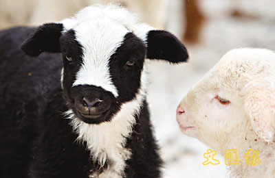 新春伊始,新疆阿勒泰兵團181團一隻面似牛犢的花臉羔羊在圈中玩耍。這隻羔羊的父母都是白色,黑白相間的毛色可能是因上代雜交。中新社
