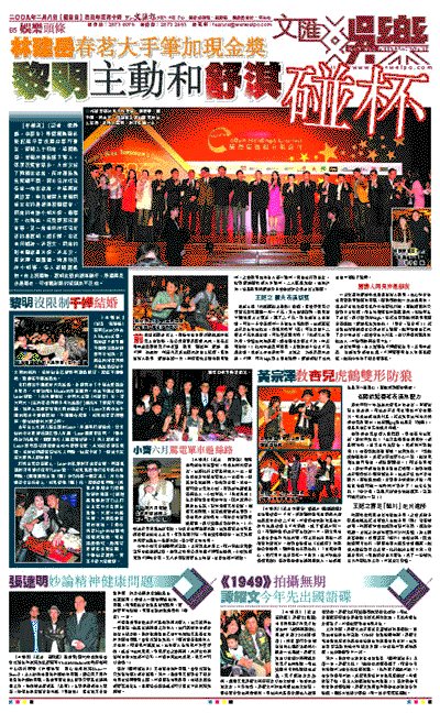 【本報訊】(記者 梁靜儀、李慶全)豐德麗集團前晚假灣仔君悅酒店舉行春茗,筵開三十四席,場面熱鬧,老闆林建岳旗下藝人、導演及賓客眾多,大會安排了兩圍主家席,而林建岳為免照顧不周,與女兒林恬兒各坐一檯主家席,中場再對調位置,率先能與大老闆同坐左右的是舒淇和劉德華,同席的有徐小明夫婦、詹瑞文、杜琪峰、任賢齊和任達華等,另一席坐於林恬兒左邊的是黎明、楊千嬅,右邊有何韻詩、許冠文,同席的則有劉家昌夫婦、許志安、黃宗澤、劉偉強、樂易玲及林小明等,各人都開懷暢飲。台上祝酒時,黎明主動向舒淇碰杯,所謂再見亦是朋友,可惜攝影師的鏡頭來不及拍。