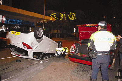 ■本月2日,一輛失控的私家車在鯉景灣四輪朝天翻轉路中,並撞及路邊一輛的士尾部。司機涉嫌醉酒駕駛。