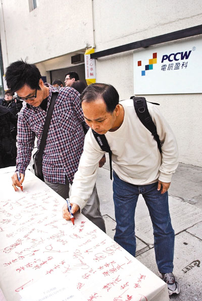 ■電盈職工總會昨早在美孚電盈工程中心外,收集員工簽名,抗議電盈裁員減薪。 本報記者莫雪芝 攝