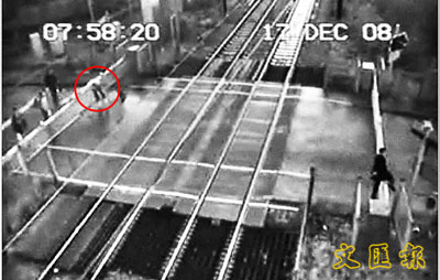 英國「網絡鐵路」公司前日播放一段由閉路電視拍到的驚險畫面,顯示一名男子無視警告擅闖路軌,在不到1秒間險些被疾馳的火車輾死。該公司希望藉該片段提高民眾對交通規則的重視。