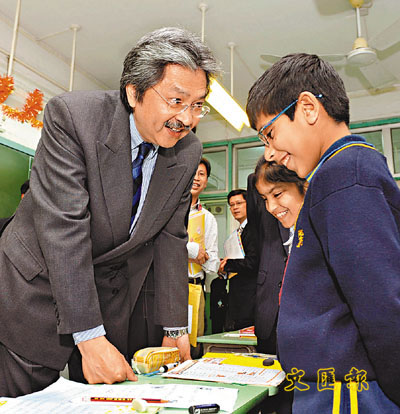 ■財爺曾俊華昨午訪問葵興h中華傳道會許大同學校。圖為曾俊華與功課輔導班的非華語學生交談,了解他們的學習情況。