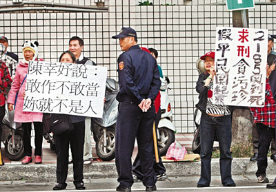 ■吳淑珍出庭, 場外民眾高舉「敢作不敢當,妳就不是人」、「2185關到死」等牌子表達訴求。法新社