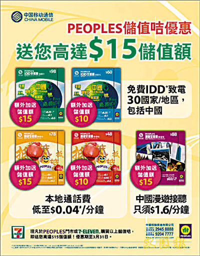 由即日起至2009年3月31日,顧客凡於PEOPLES門市及7-Eleven便利店選購指定PEOPLES儲值咭,即享高達$15額外儲值額。