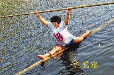 一個貴州婦女身懷絕技,在浮在河上的一枝竹竿上表演一字馬。 新華社