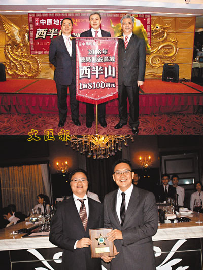 ■(上圖)中原地產西半山高級營業董事李巍,於去年締造1.81億元的理想佳績,連續3年榮膺最高營業額董事。(下圖)香港置業行政總裁李志成 (右)親自頒發「2008年區域營業額盈利大獎」予九龍區助理區域董事黃永忠。