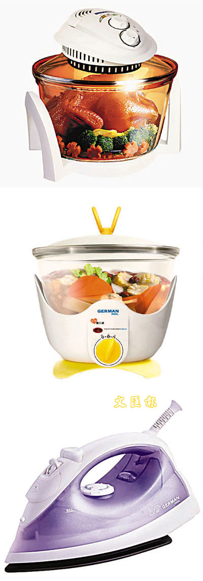 ■(上圖)光波萬能煮食鍋 CKY-19M。(中圖)保健養生鍋GMD-35。(下圖)蒸氣熨斗RT-1120。