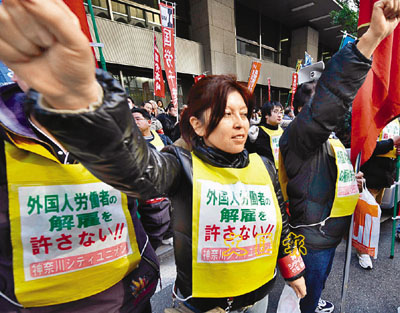 日本全勞協主席藤崎亮三在聯合會外高聲抗議,指企業為了生存,摒棄社會責任,工人的工作權和生活權受到踐踏。金融海嘯下,許多日裔秘魯人和巴西人成為首先被裁一群,不少日籍外國人昨日亦加入遊行行列。
